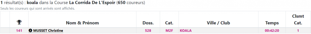 Christine était présente sur le 10Kms, et sur la lancée de son marathon et semi-marathon elle termine 9ème féminine et 1ère M2 dans un chrono de 42min20sec !