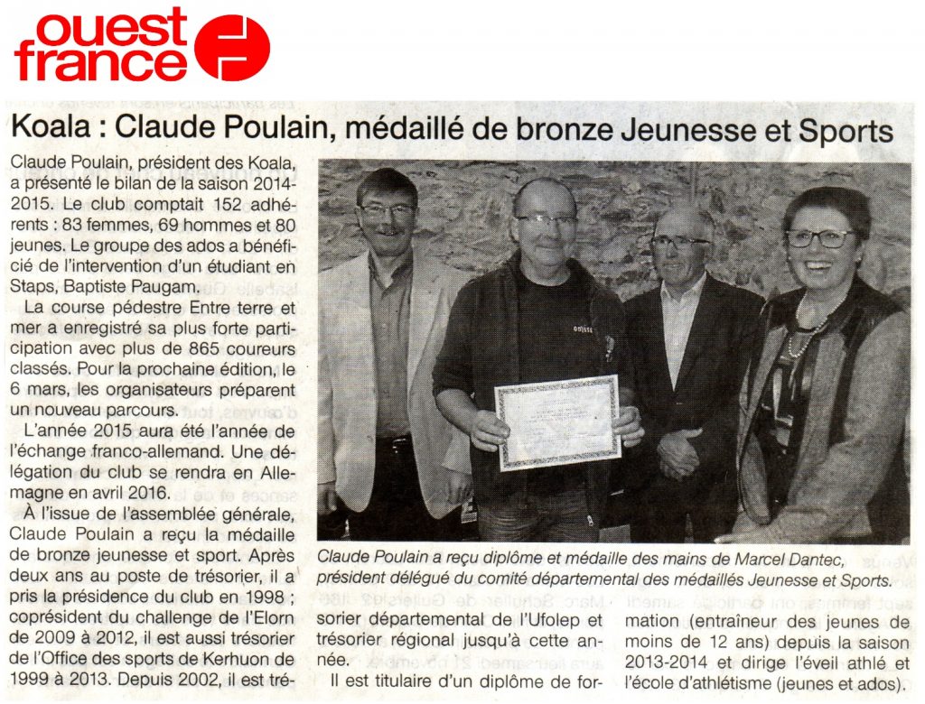 - 25 Septembre 2015 : Le président à l’honneur lors de l’assemblée générale avec la remise de la médaille de bronze Jeunesse et Sport 🎖