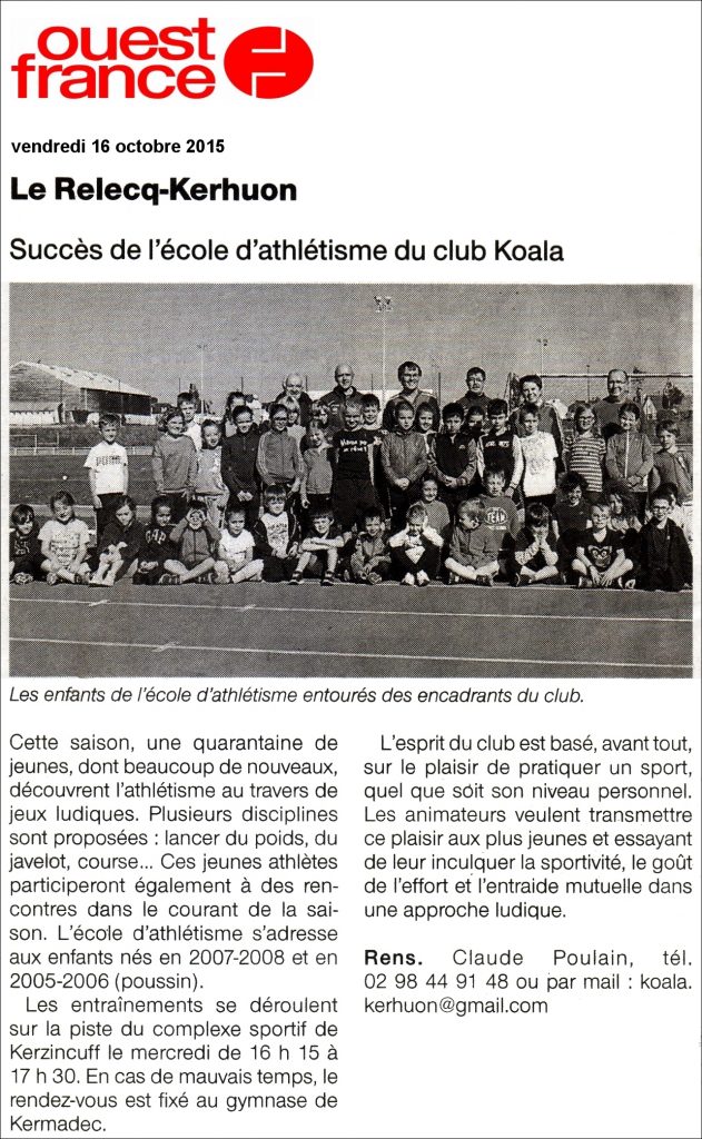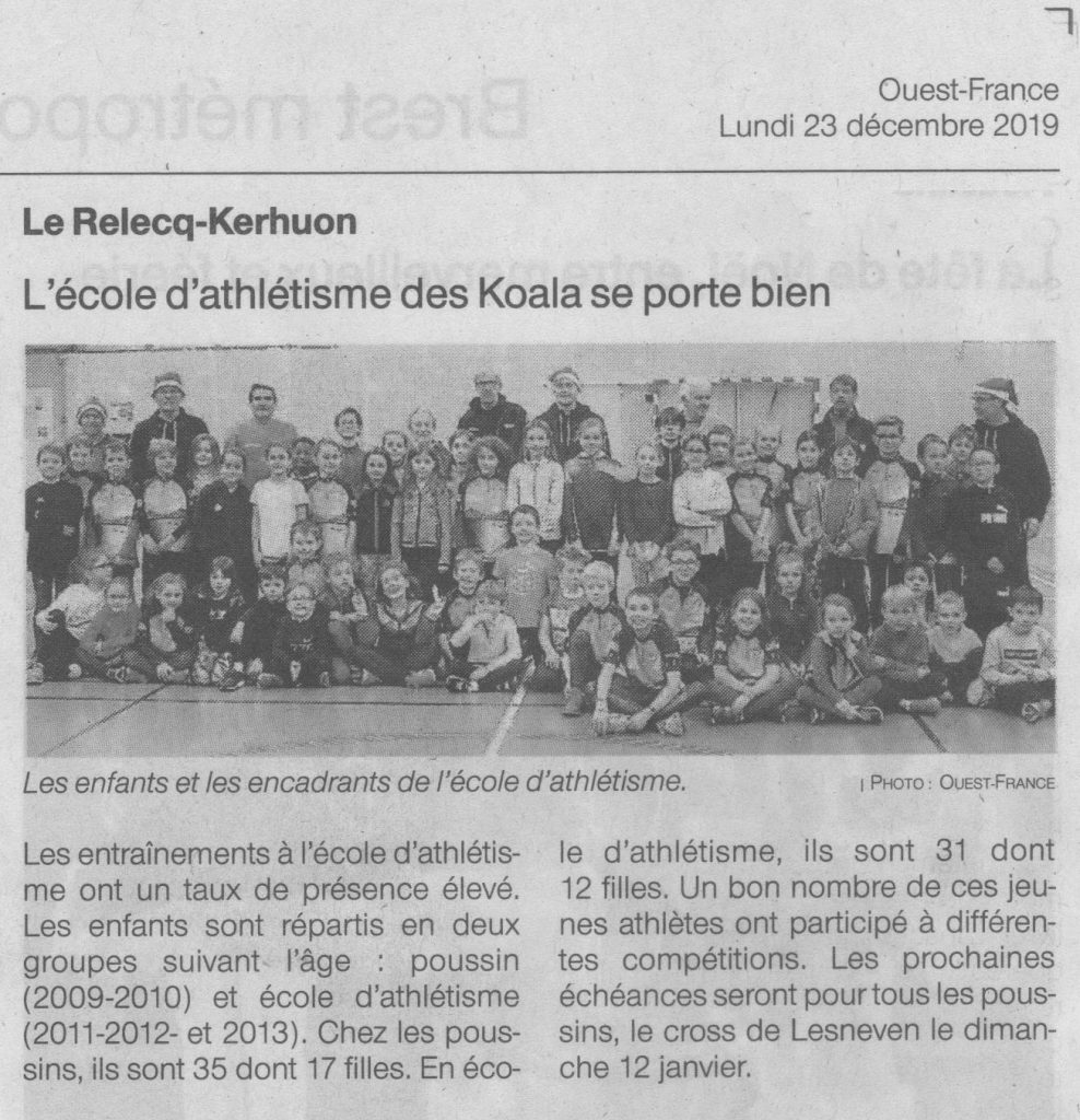 - Article Ouest-France du 23 Décembre 2019 sur la bonne santé de l’école d’Athlétisme :